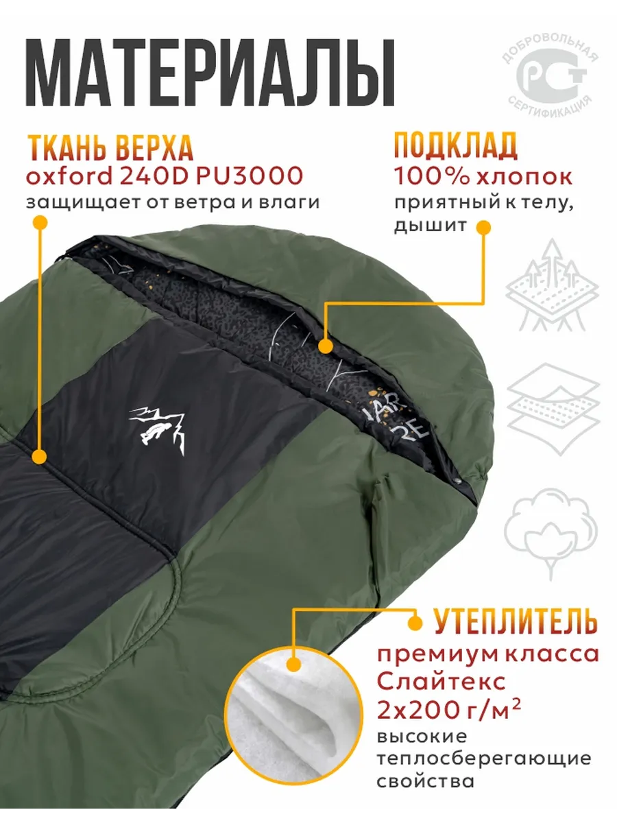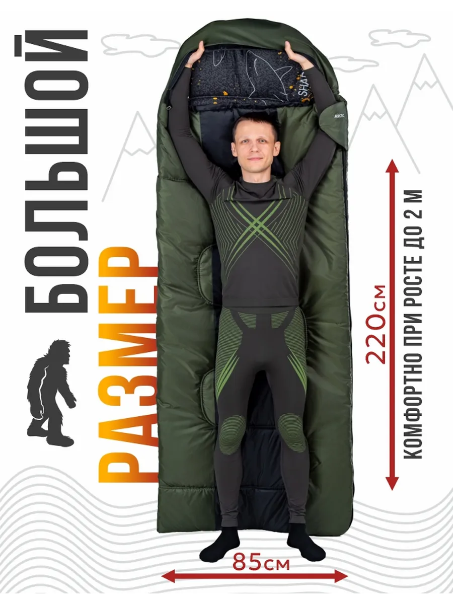 Спальный мешок большого размера - незаменимая вещь для любого туриста или просто любителя активного отдыха. Изготовлен из дышащей внутри и водоотталкивающей ткани снаружи, обеспечивающей комфортный микроклимат. Забудьте о неприятном потении и намокании. Пригодится для похода или туризма, зимней охоты или военных учений.